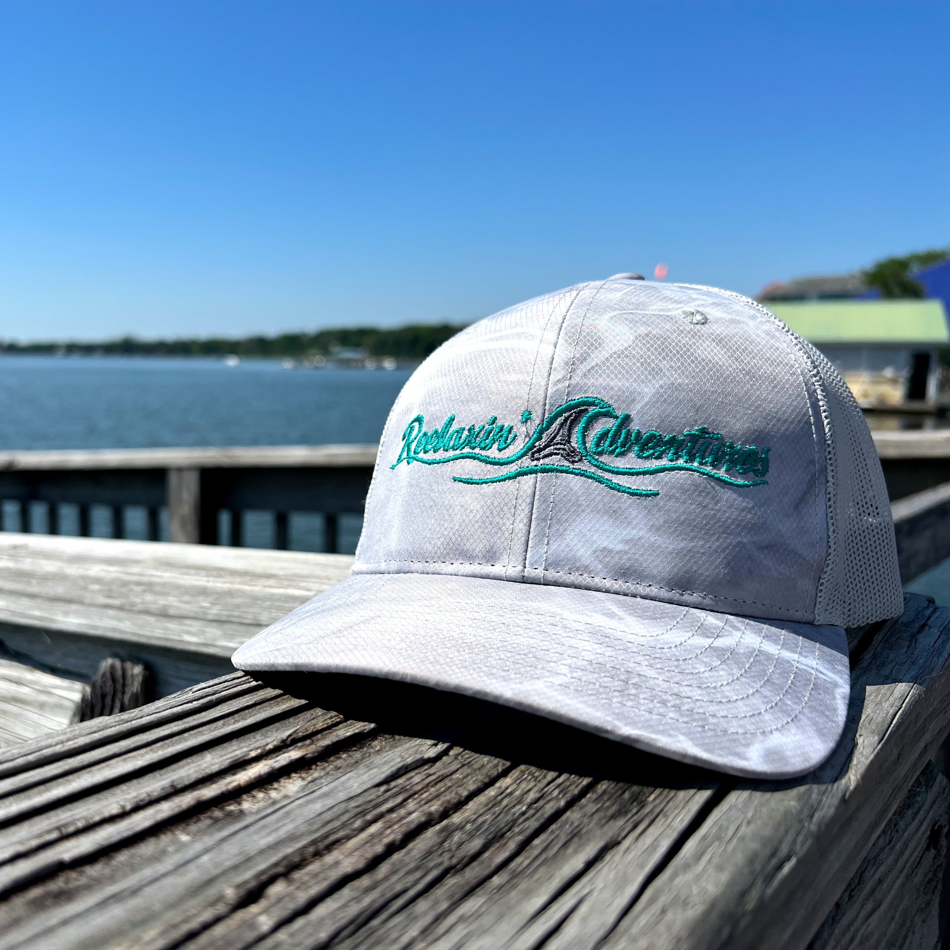 This is a high quality Richardson 112 snapback trucker hat with the Mossy Oak Elements Bonefish pattern. Custom embroidered with the Reelaxin' Adventures logo in a bright teal and charcoal pattern. One size fits all.